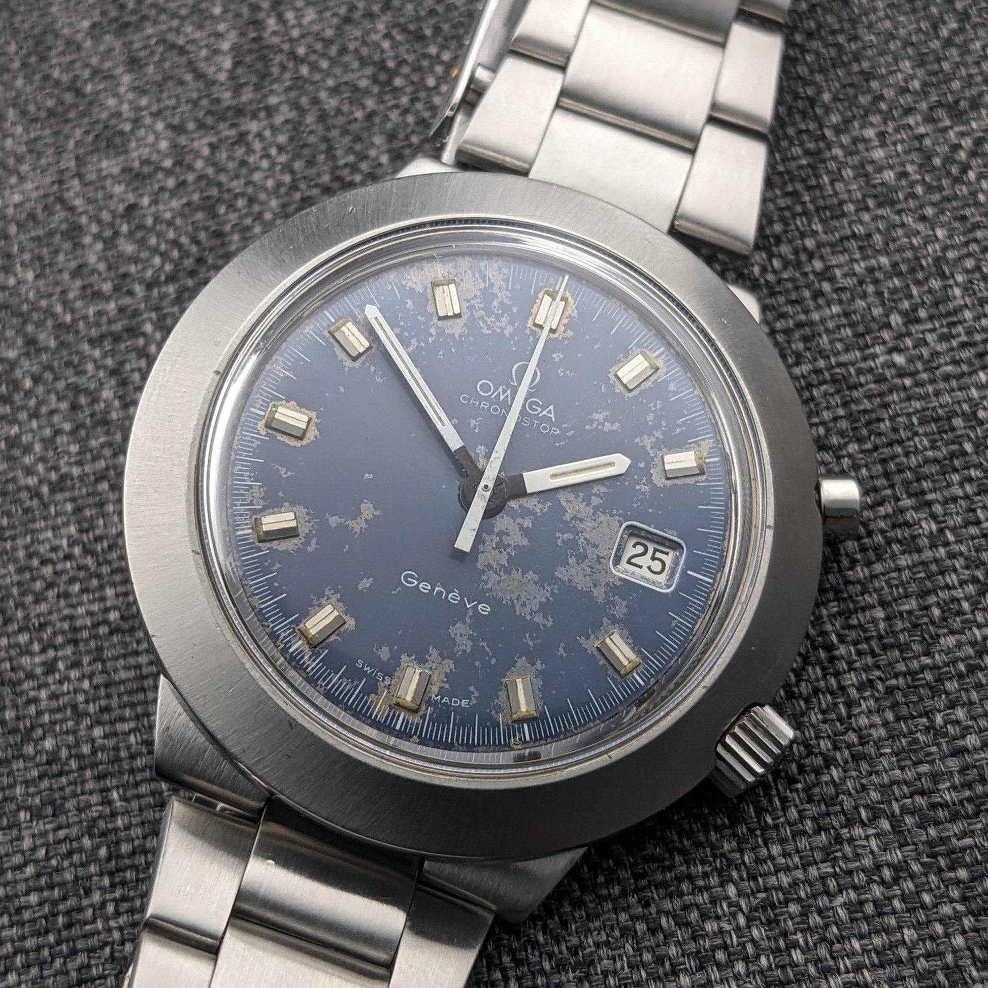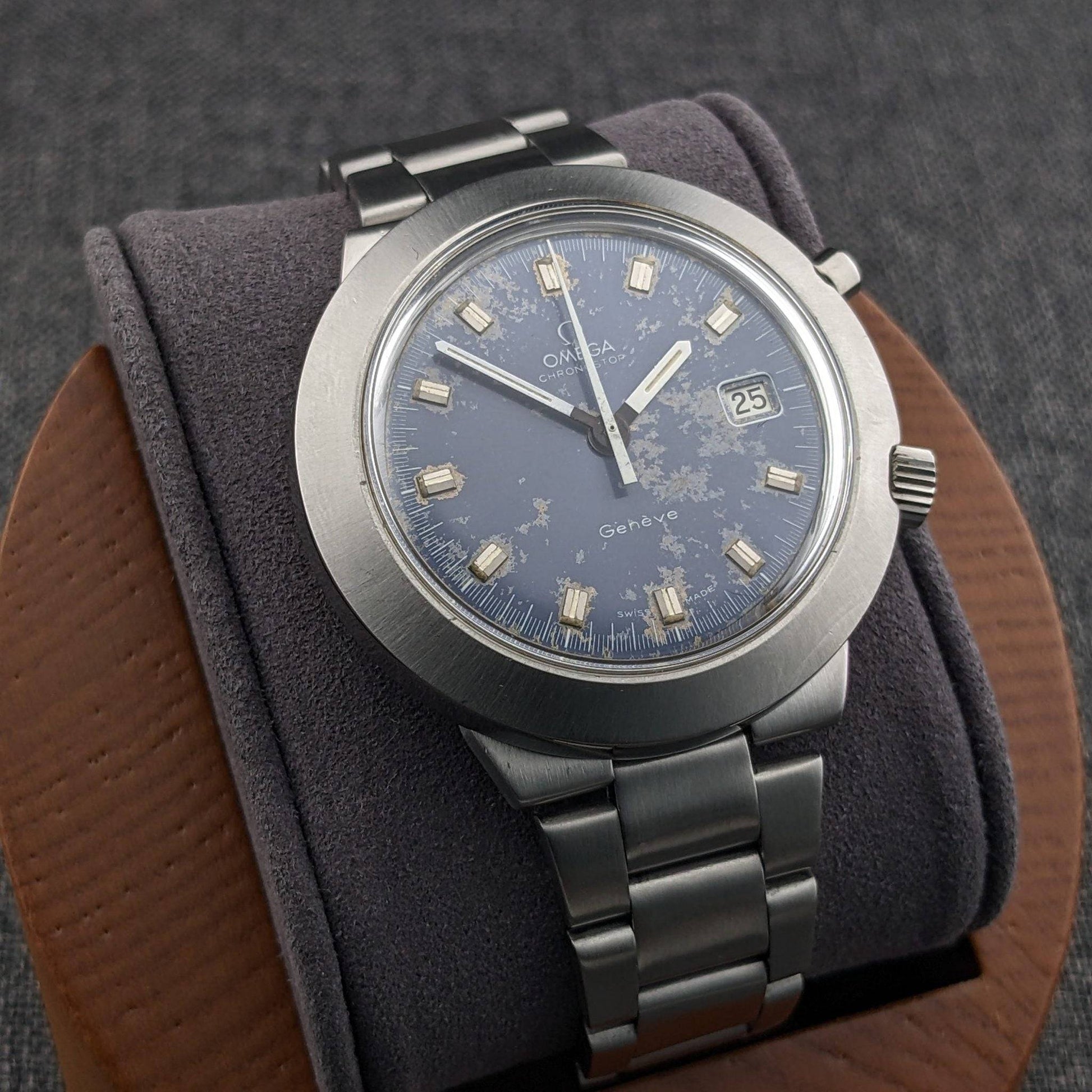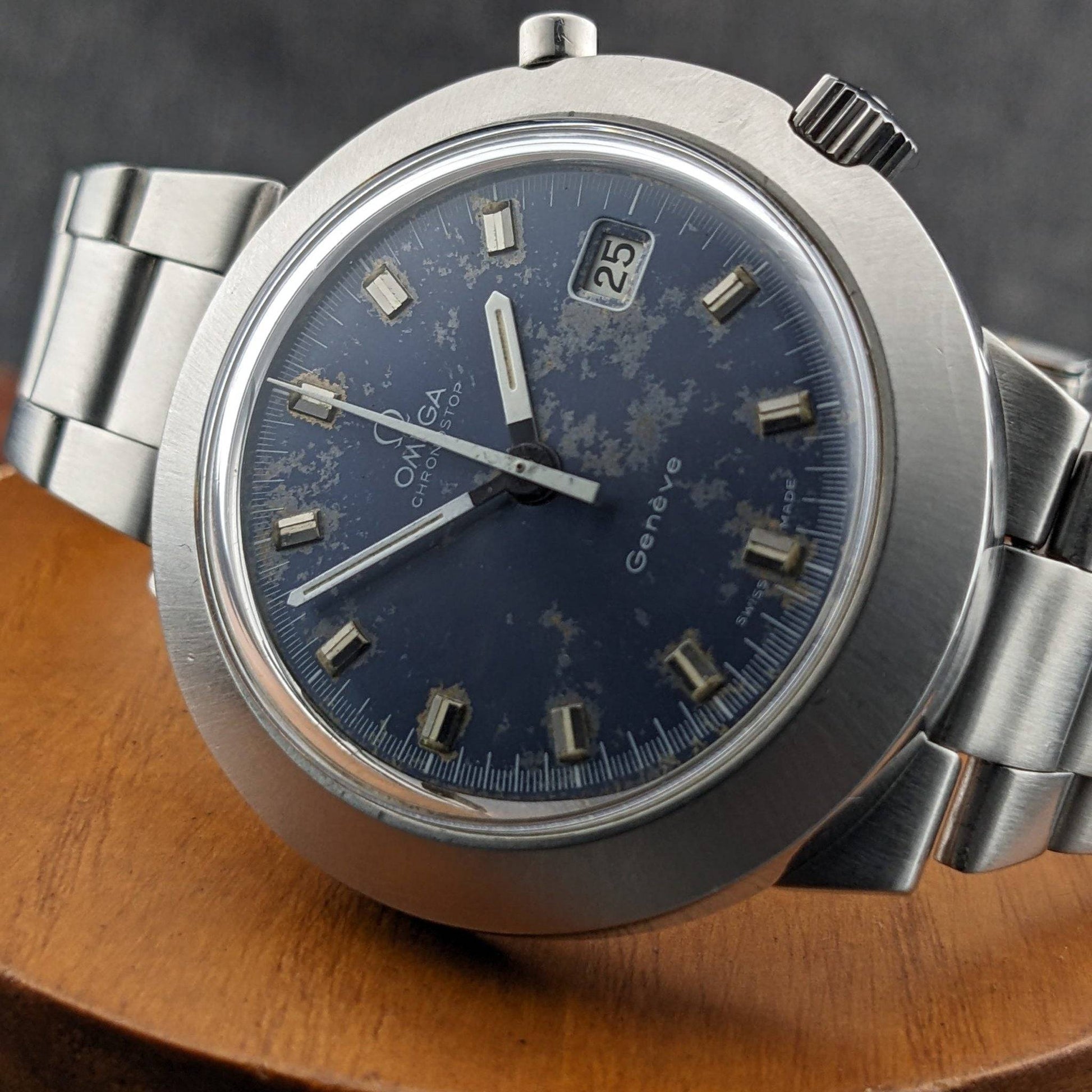 The Omega Chronostop Geneve Reference 146012 is a distinctive timepiece from the late 1960s, embodying Omega's innovative spirit of the era. This model stands out with its large 42mm case in the unique UFO or Dynamic-style design, paired with an integrated steel bracelet—a hallmark of Omega's late 1960s Italian-market Chronostop variants. The watch features the rare Caliber 920 movement, a date-equipped manual wind monopusher chronograph, making it part of the smaller production side of the Chronostop family. With only about 61,000 pieces produced, compared to the 124,000 no-date models, the Caliber 920 is a prized find for collectors. The original blue dial of this watch, despite its age-related spotting and surface wear, remains a testament to its authenticity and vintage appeal. The combination of the large case, date complication, and the original dial offers a truly period-correct profile that appeals to discerning collectors.
