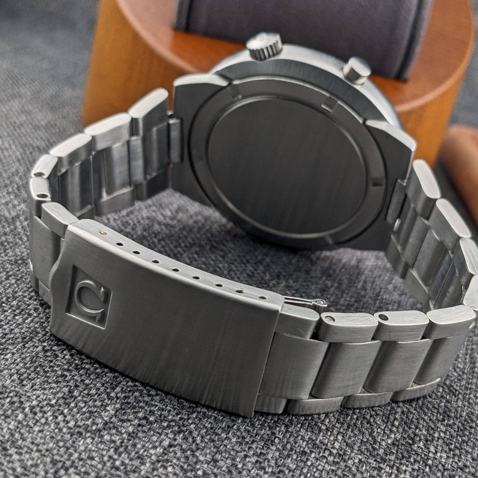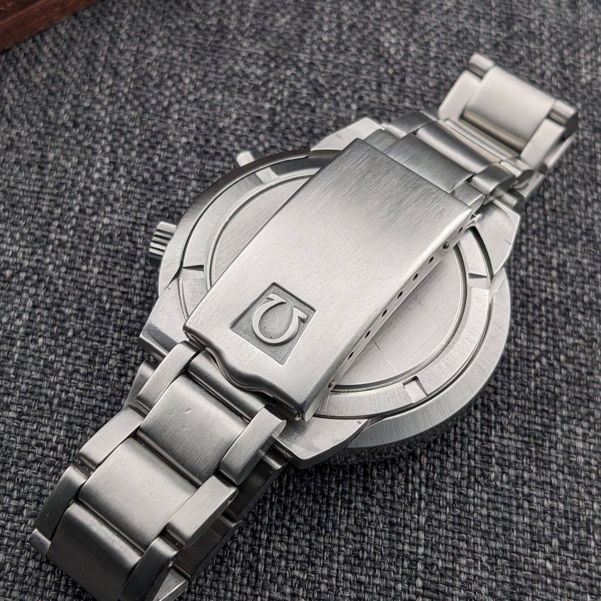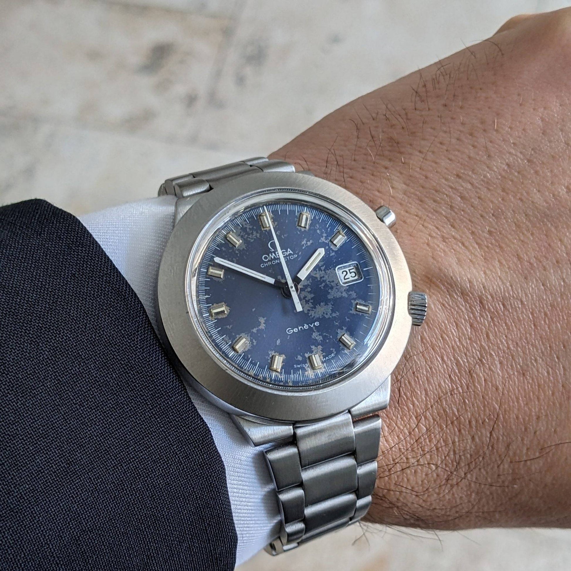 The Omega Chronostop Geneve Reference 146012 is a distinctive timepiece from the late 1960s, embodying Omega's innovative spirit of the era. This model stands out with its large 42mm case in the unique UFO or Dynamic-style design, paired with an integrated steel bracelet—a hallmark of Omega's late 1960s Italian-market Chronostop variants. The watch features the rare Caliber 920 movement, a date-equipped manual wind monopusher chronograph, making it part of the smaller production side of the Chronostop family. With only about 61,000 pieces produced, compared to the 124,000 no-date models, the Caliber 920 is a prized find for collectors. The original blue dial of this watch, despite its age-related spotting and surface wear, remains a testament to its authenticity and vintage appeal. The combination of the large case, date complication, and the original dial offers a truly period-correct profile that appeals to discerning collectors.