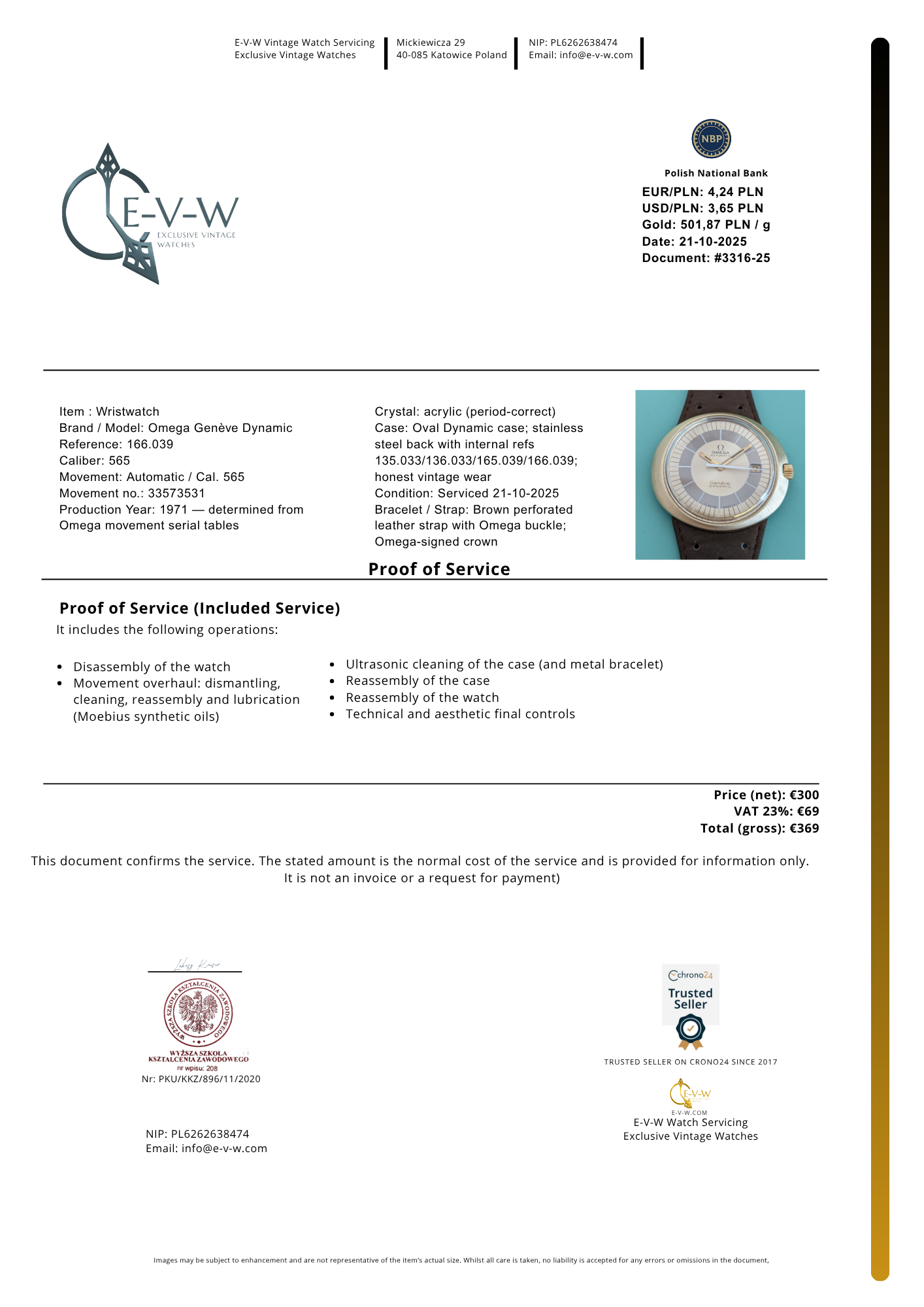 Documents: Invoice and our service certificate worth €369 — included free of charge