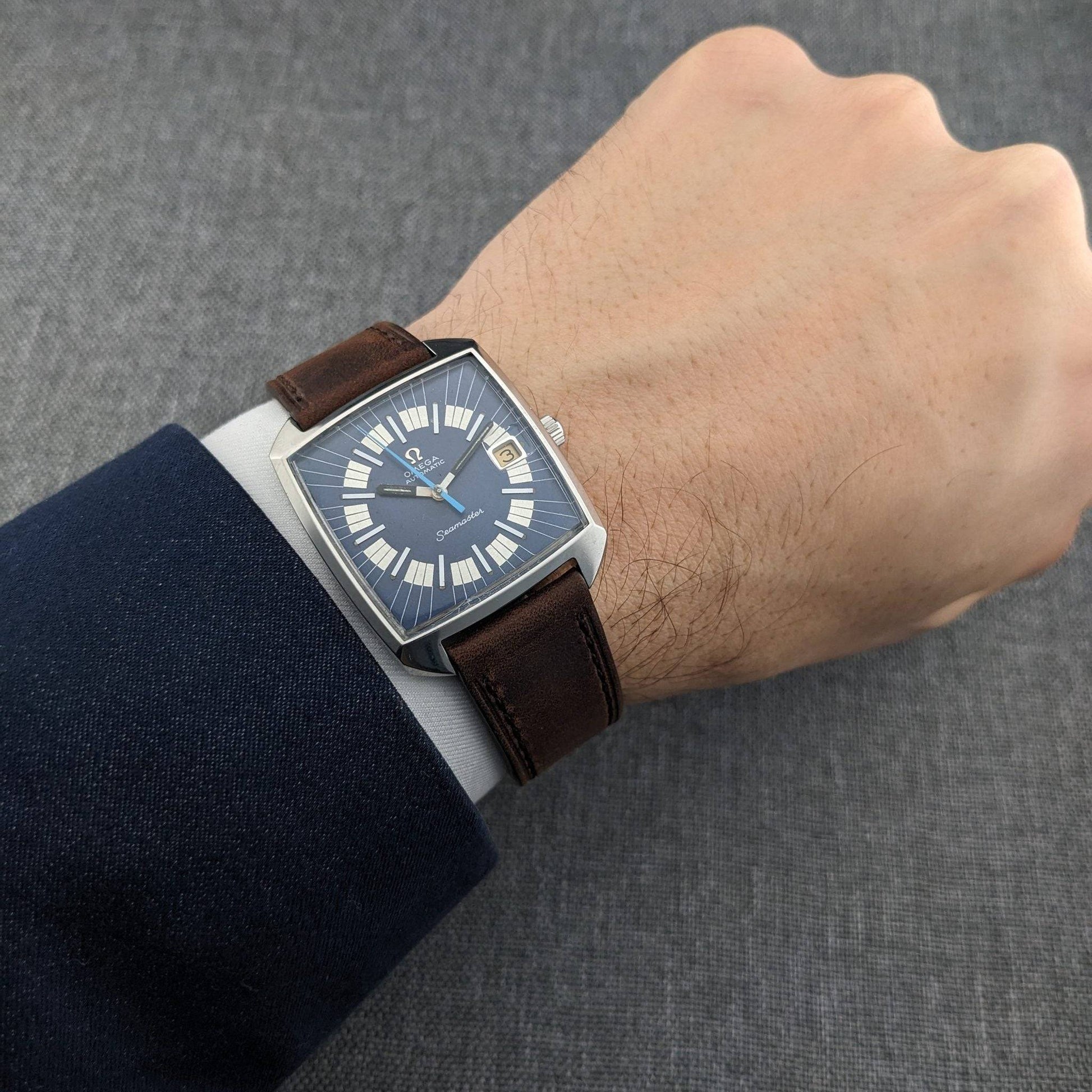 • Dial: Original blue dial with white radial block markers, framed date at 3, applied Omega logo, and blue sweep seconds hand