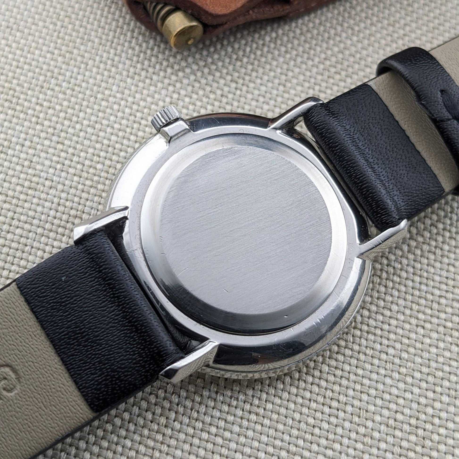 This minimalist, time-only Omega De Ville showcases a silver dial with applied baton hour markers and a two-hand layout, epitomizing the late-1960s dress-watch style. The watch features a thin profile, restrained printing, and a wide, clean dial surface. The original dial displays an honest patina with light spotting and age-related discoloration, particularly near the perimeter and outer minutes track. Inside the caseback, the reference 111.077 and stainless steel marking (Acier Inoxydable) are clearly stamped. The polished stainless steel case exhibits straight lugs and visible wear from use, including surface scratches and softened edges consistent with its age. The Caliber 620 is a compact, manual-wind movement from Omega’s mid-century hand-wound families, known for its application in straightforward dress watches. The movement photo confirms correct Omega signing and jewel count. A recent service date is recorded as 2.03.2026.