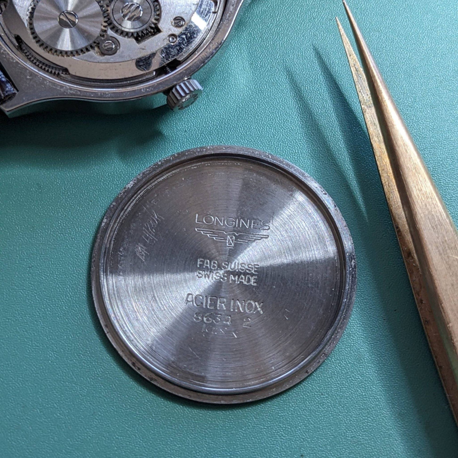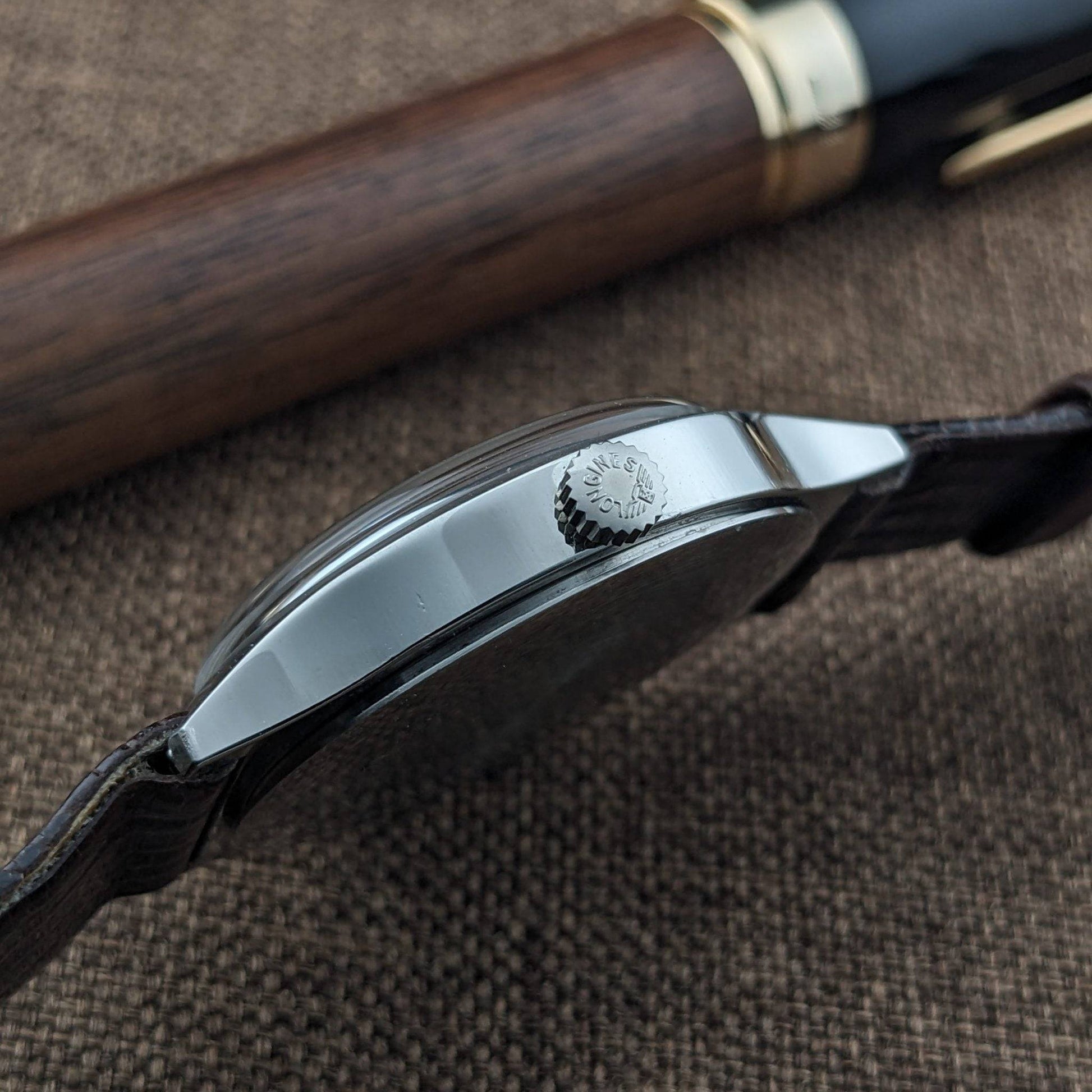 參考編號8634 2清晰地印在殼蓋內,符合此Flagship的參考格式。不銹鋼殼帶有法文不銹鋼標記ACIER INOX,符合當時的瑞士出口公約。簽名的表冠為正品的積極信號,尤其當它與Longines時期硬件相對應時。33毫米x 9毫米的手動上鏈正裝比例是當時的代表性設計,且在現代收藏者中愈發具備小眾品味。
