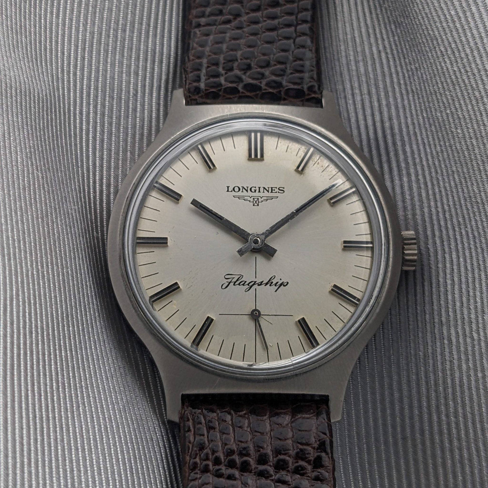 • 錶盤:原始銀色調,附條形小時標記,印刷的分鐘刻度,Longines有翼沙漏徽標和Flagship字樣;光斑和與年齡一致的自然氧化。
