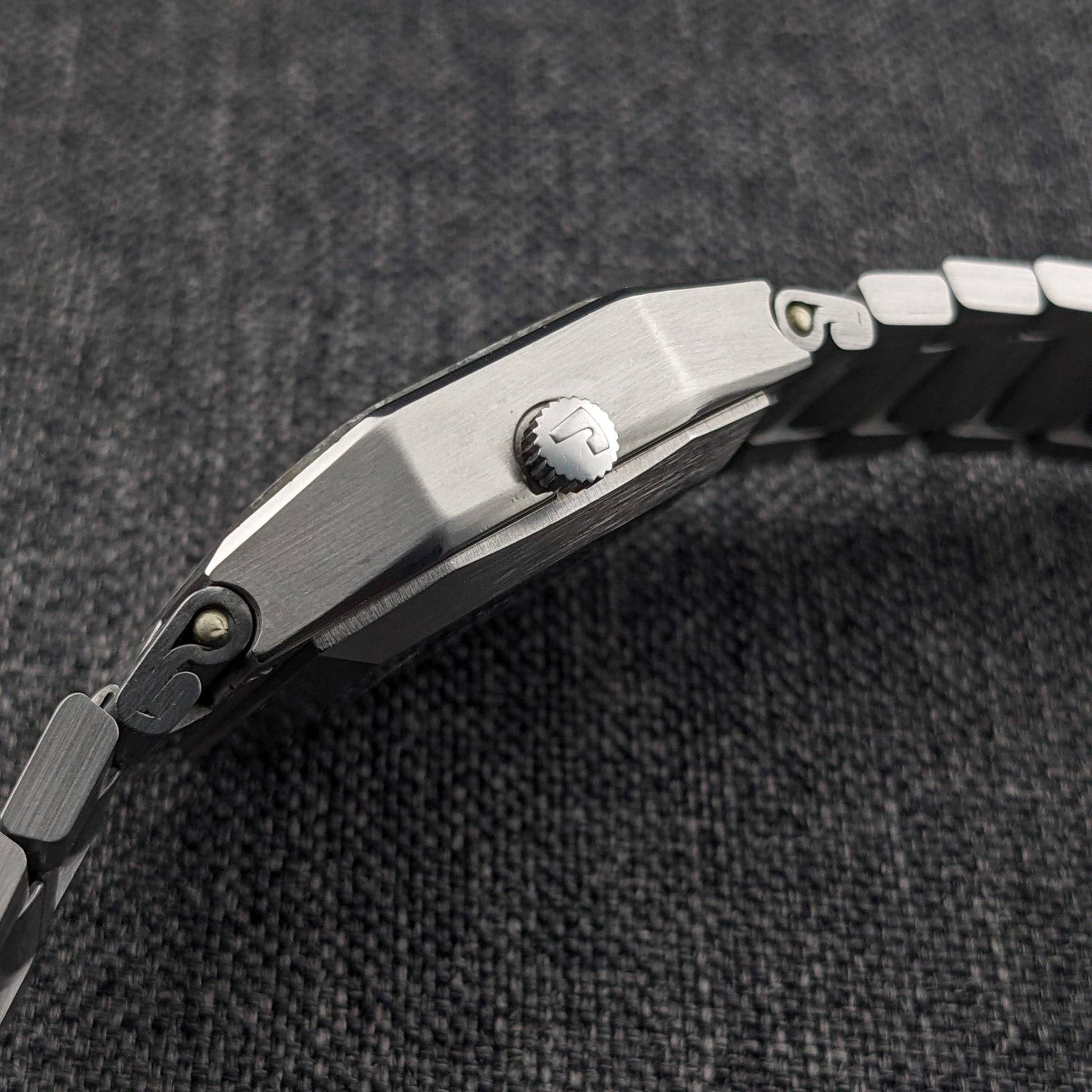Roamer Rockshell Mark II 象徵了 1970 年代的經典設計特徵,擁有多面角鋼錶殼和一體式錶帶,完美詮釋了那個時代的運動優雅美學。這款腕錶展示了一個引人注目的深藍色錶盤,配有應用的短棒標記和紅色掃秒針,與其時代正確的壓克力水晶和簽名錶冠完美和諧。腕錶由健壯的 Roamer 簽名 ETA 2789-1 自動機芯驅動,擁有 25 顆寶石和多語言日曆功能,與可視日曆佈局完美契合。錶背雕刻結合了 Rockshell 名稱,機芯和參考號 2789-9120.621,突出了該腕錶的真實性和歷史性。保留了其原始錶盤、錶帶和其他關鍵部件,此款例證了 Roamer 1970 年代系列的持久吸引力和精湛工藝。其誠實的狀況,帶有清晰背面雕刻和良好保存的刷面幾何,對於收藏家來說是一個出色的發現。